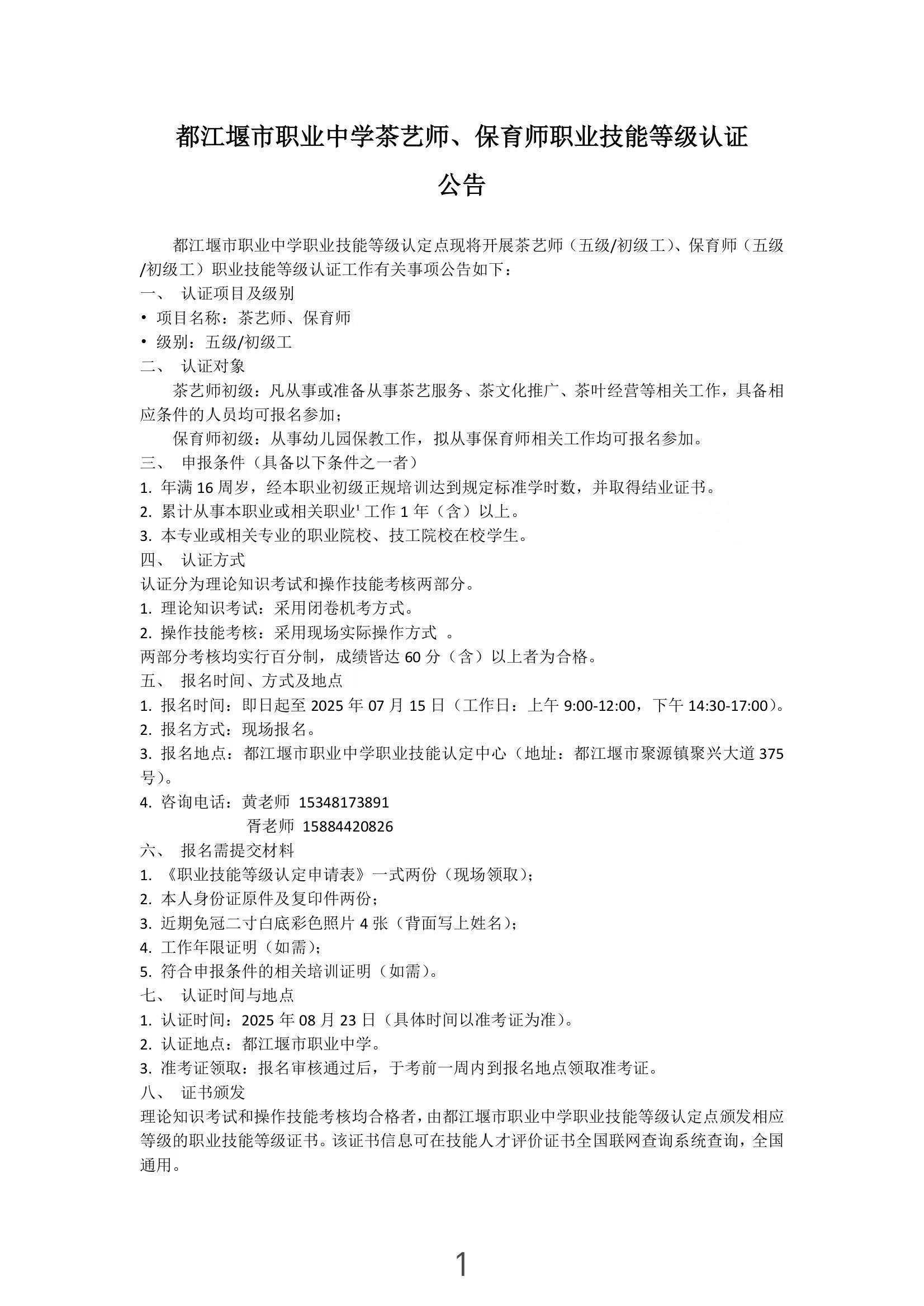 都江堰市职业中学茶艺师、保育师职业技能等级认证公告